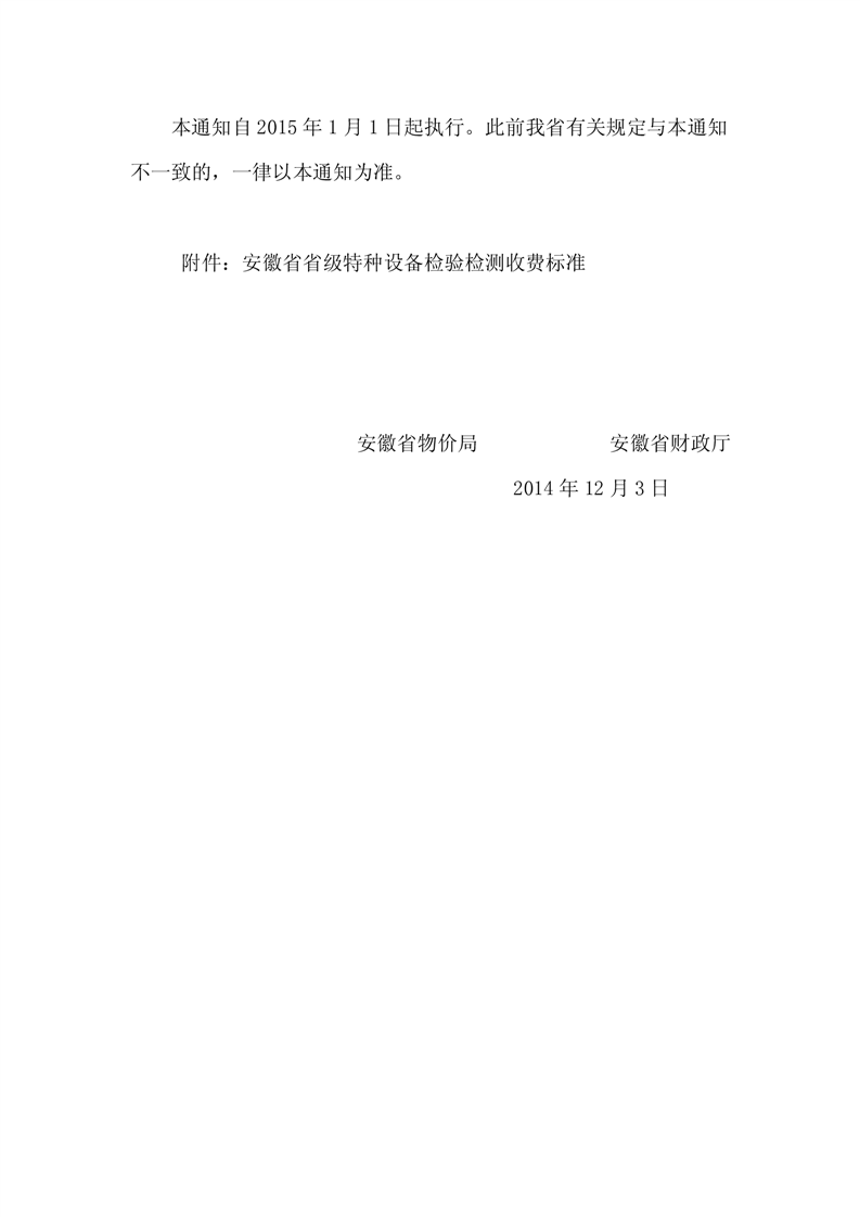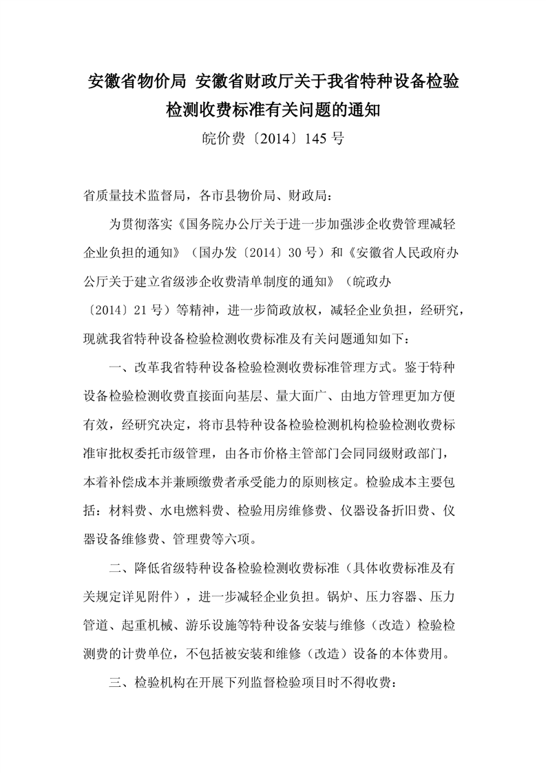 安徽省物价局 安徽省财政厅关于我省特种设备检验检测收费标准有关问题的通知
