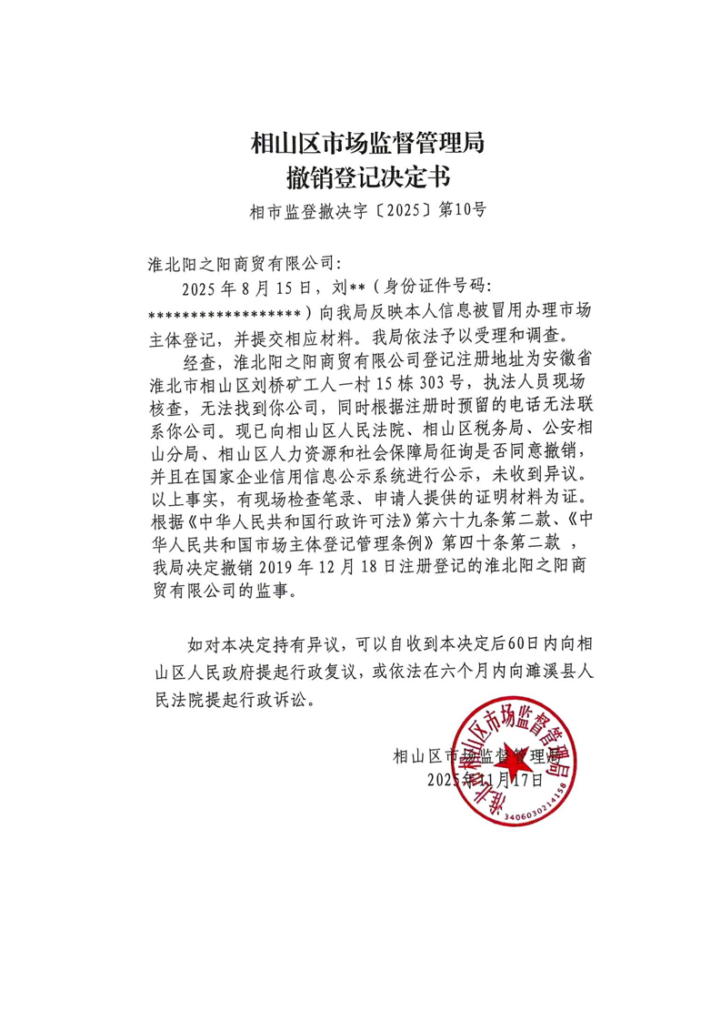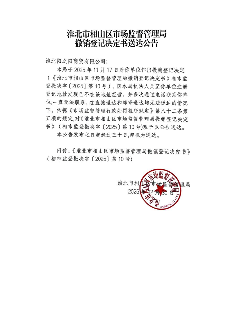 淮北市相山区市场监督管理局撤销登记决定书送达公告