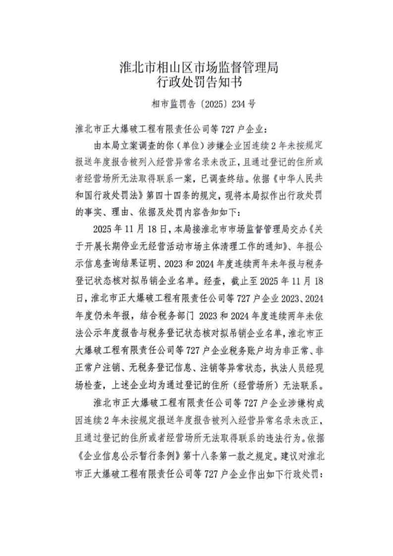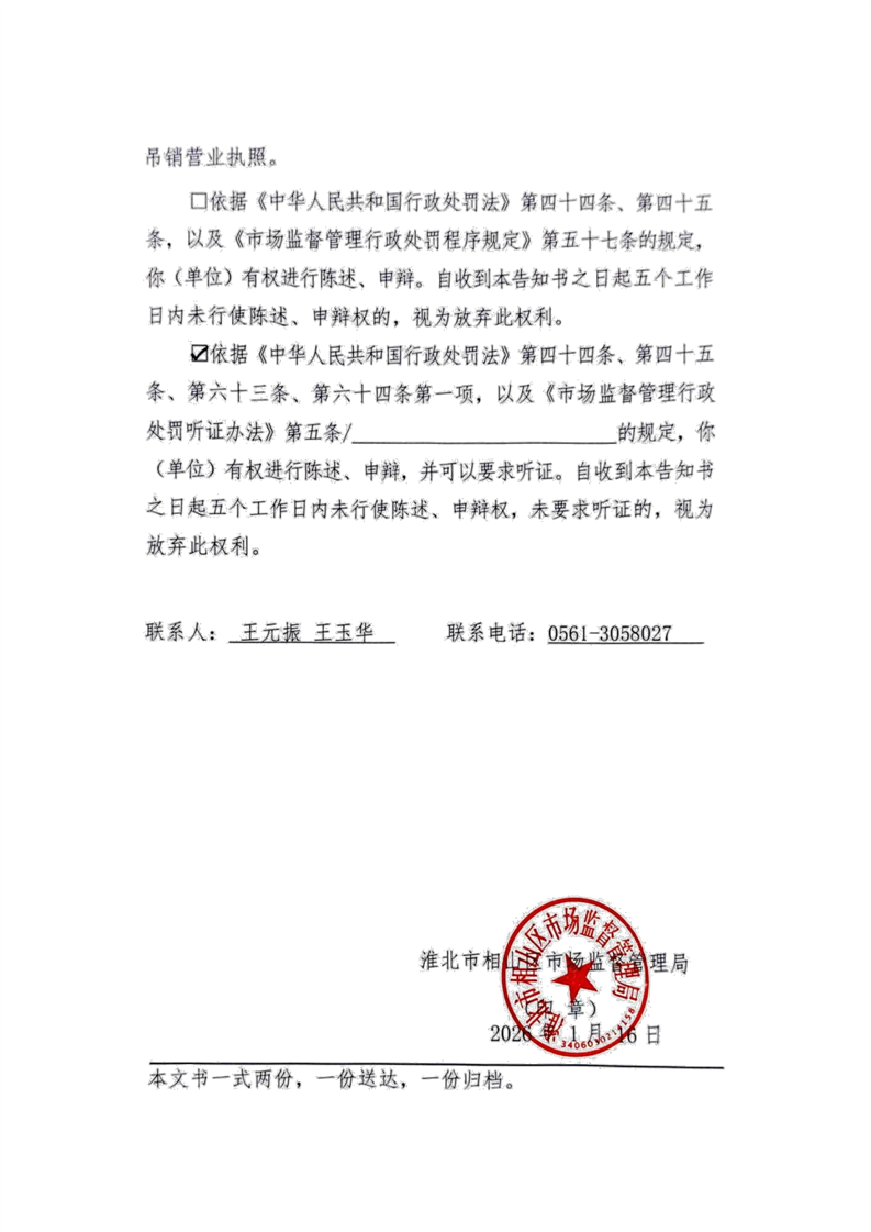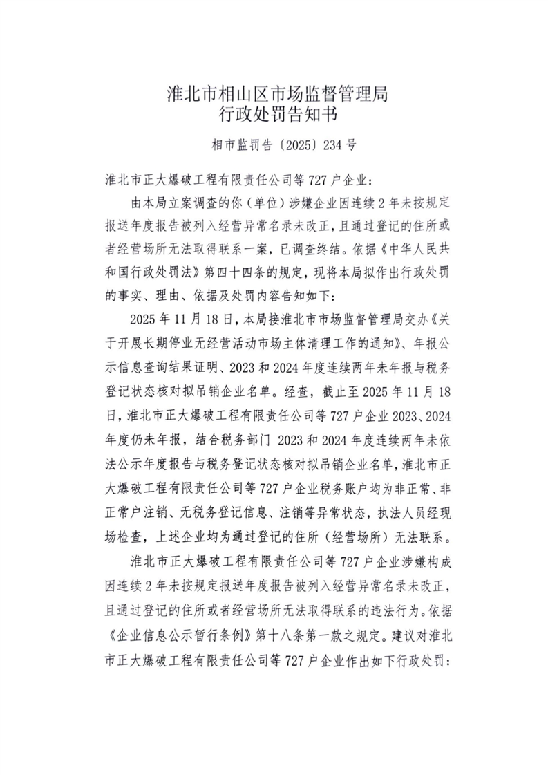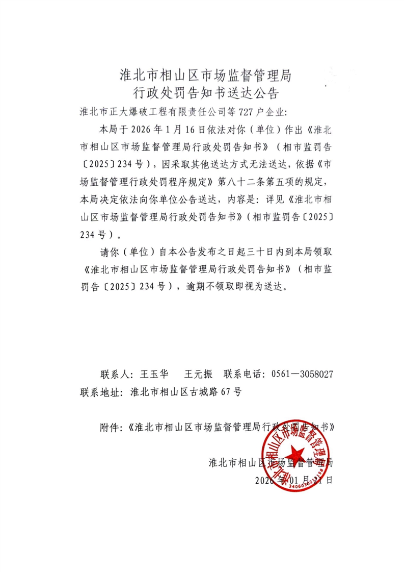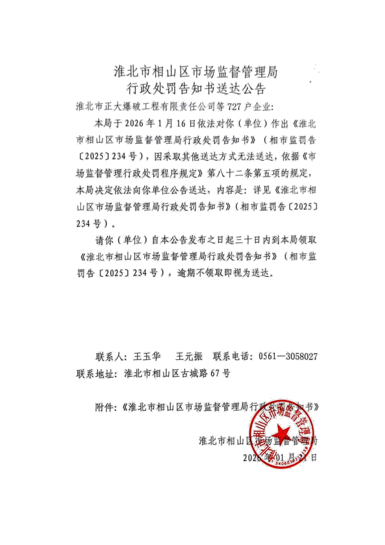 淮北市相山区市场监督管理局行政处罚告知书送达公告
