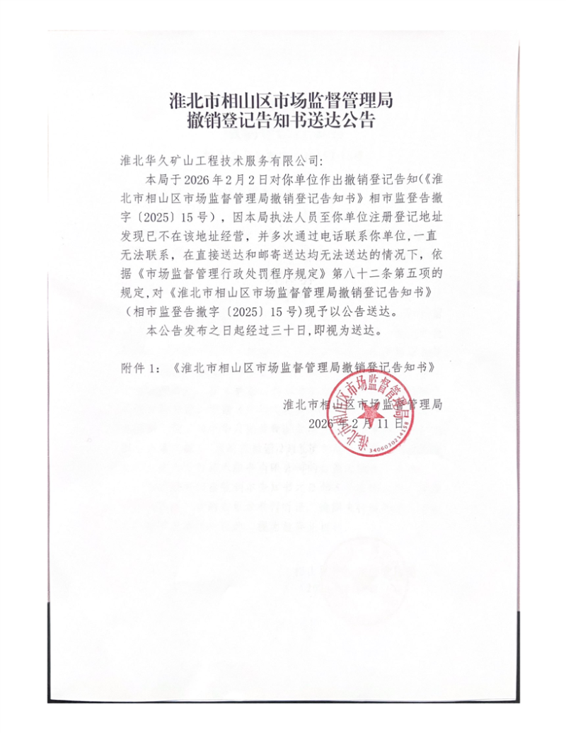 淮北市相山区市场监督管理局撤销登记告知书送达公告