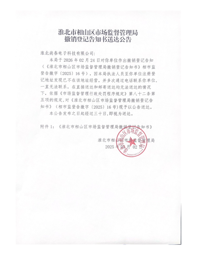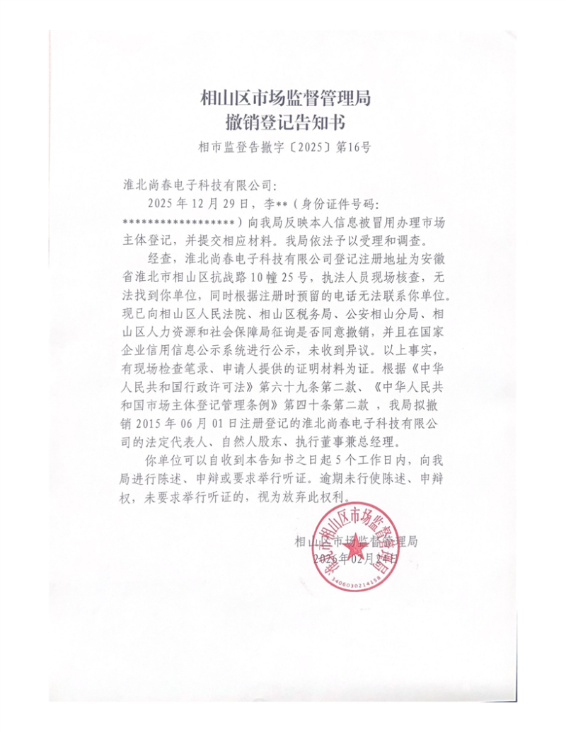 淮北市相山区市场监督管理局撤销登记告知书送达公告