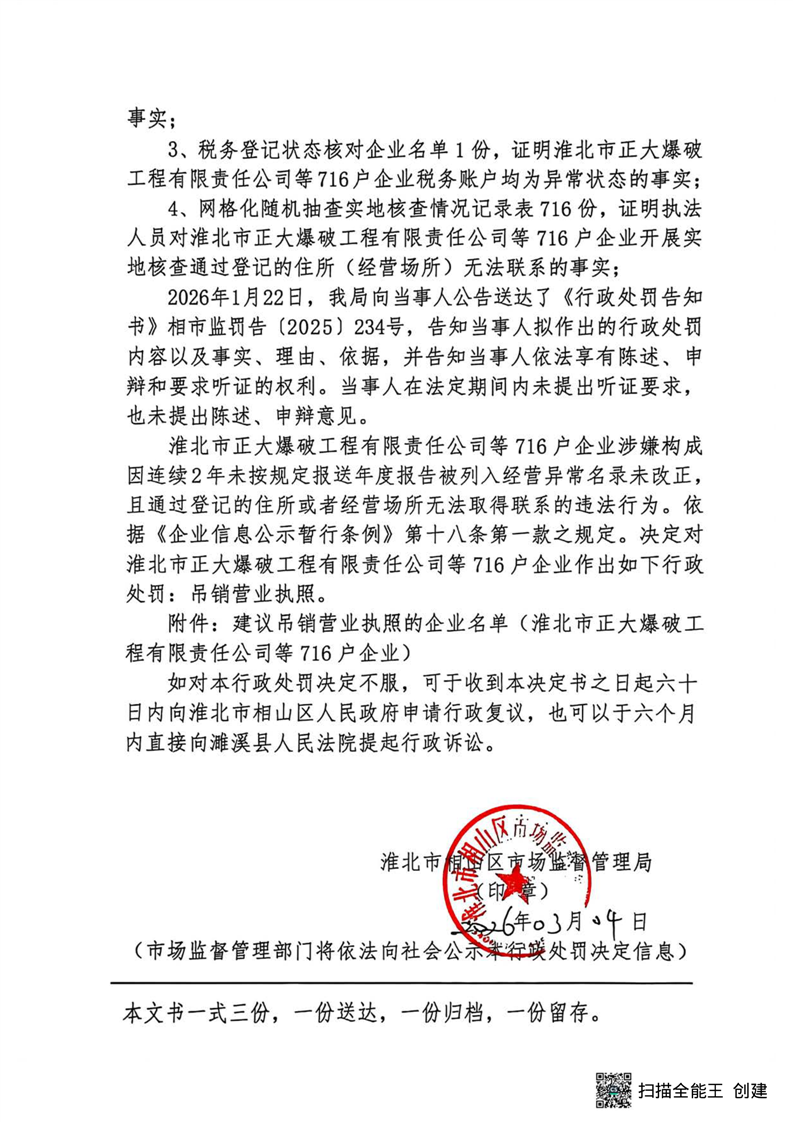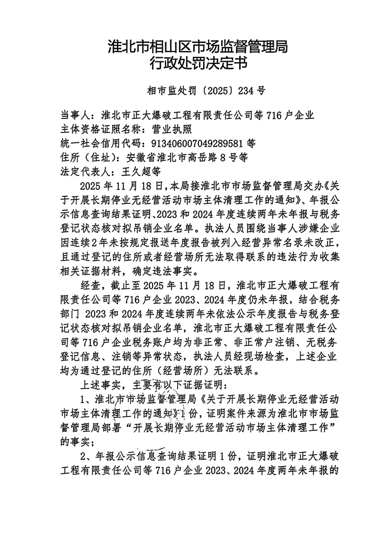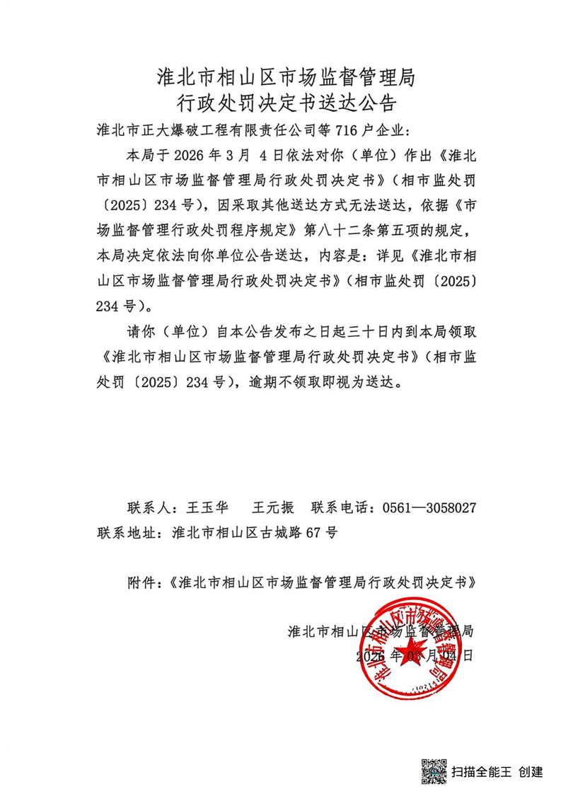 淮北市相山区市场监督管理局行政处罚决定书送达公告