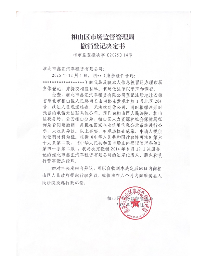 相山区市场监督管理局撤销登记决定书送达公告