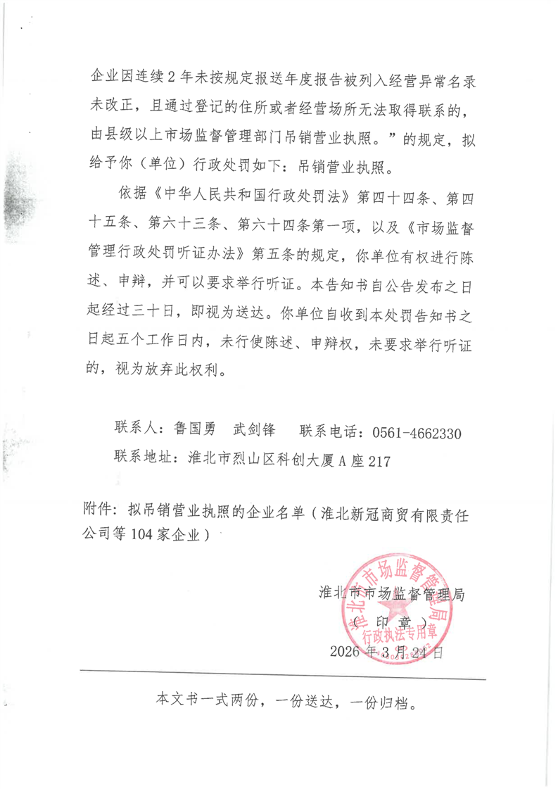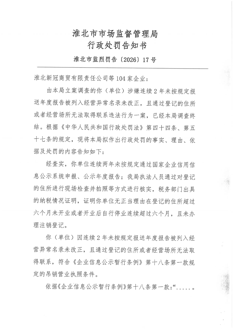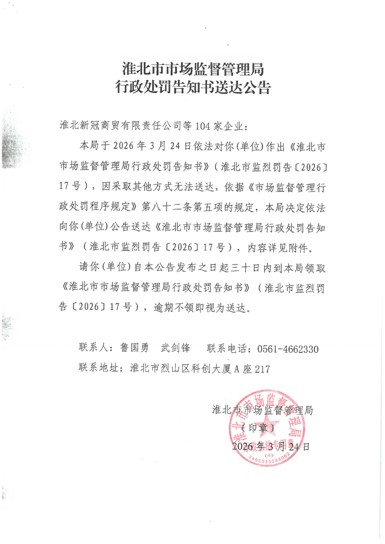 淮北市市场监督管理局行政处罚告知书送达公告