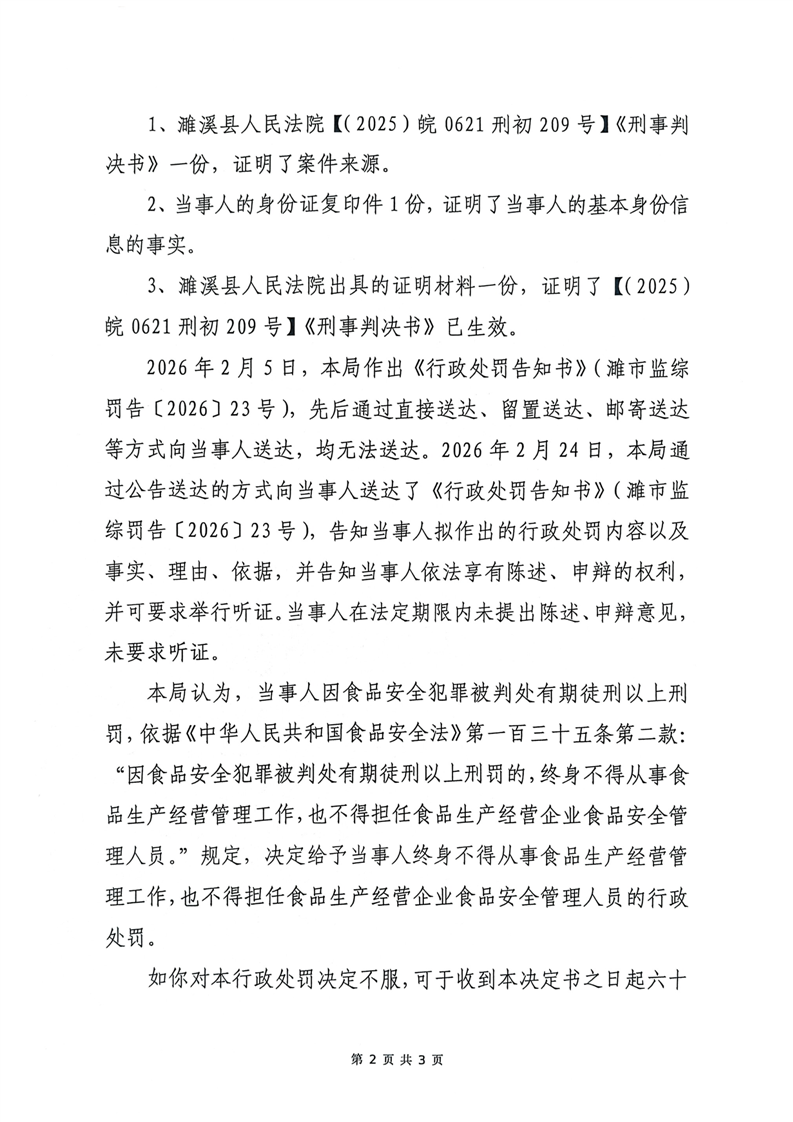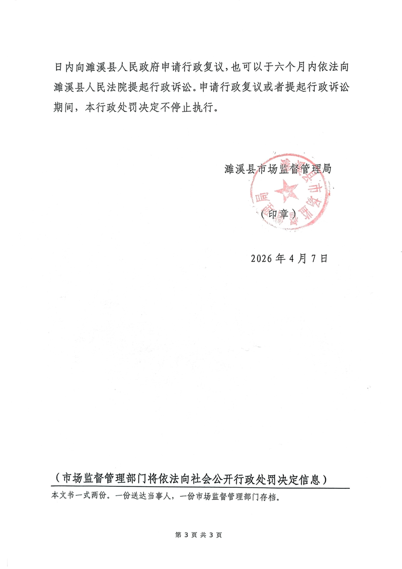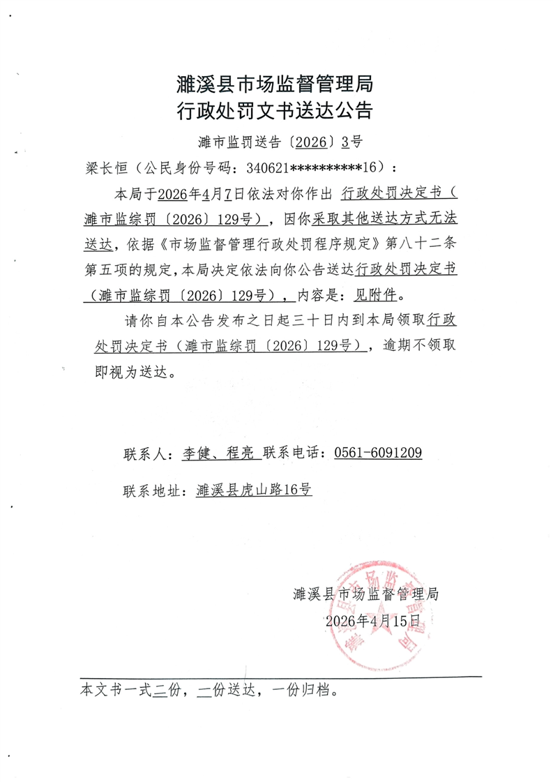 濉溪县市场监督管理局行政处罚文书送达公告