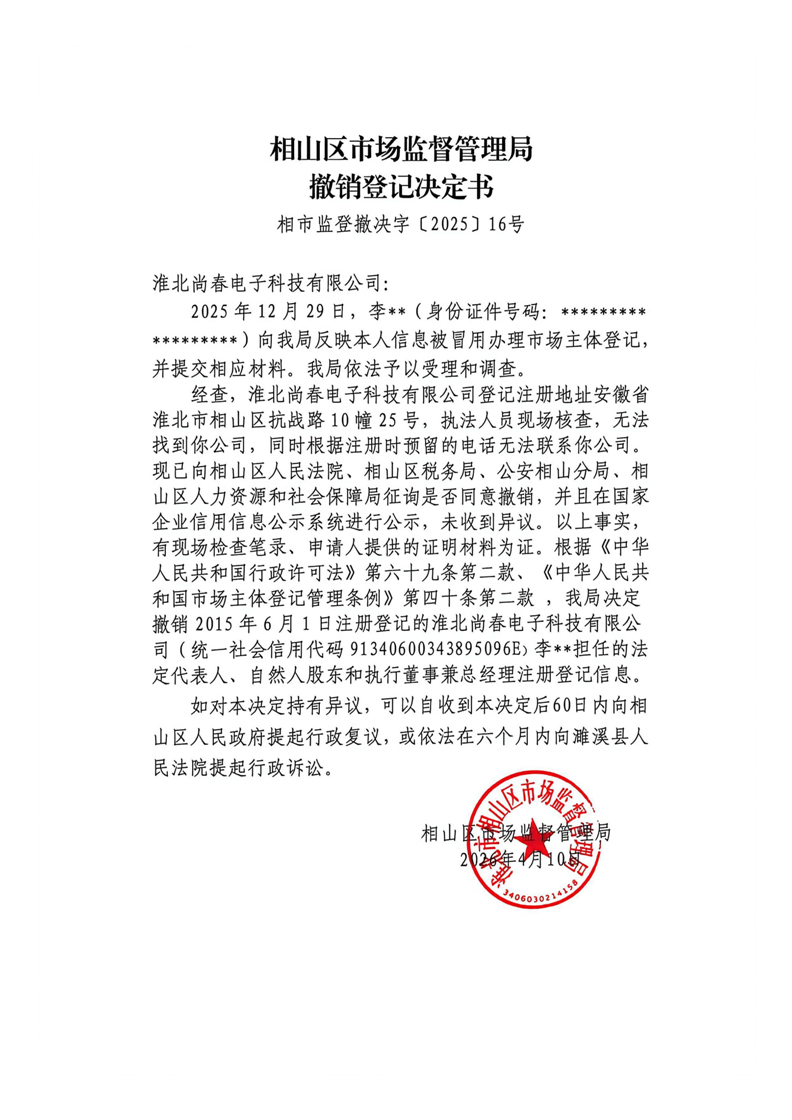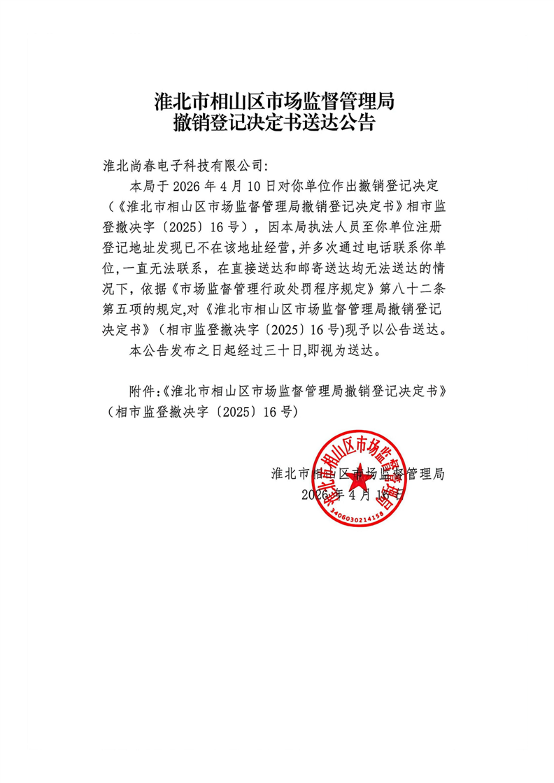 淮北市相山区市场监督管理局撤销登记决定书送达公告